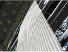 まず、外観のダイナミックなシェイプは、〈 クライアント会社の勢い 〉をアピールしていますが、〈 株価のダイナミズム 〉というイメージとも共鳴させています。 たまたま両側の隣接ビルが茶系タイルのシックな外観をしているということで、外装ルーバーのホワイト色を微妙に黄帯させてなじませています。 またルーバーの前面側の角をまるく面取りして、歩行者の眼線にやさしい視覚的触感をあたえています。 また、夜間のライトアップは、あえて均質的なものを避けて、周囲の夜景の雑多な光に呼応するようなかたちにしました。
